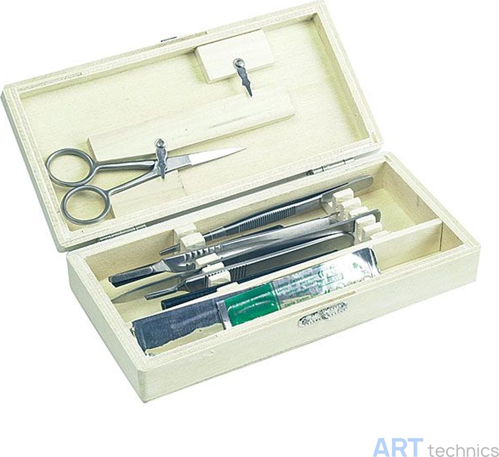 В комплект входят следующие изделия: рукоятка для скальпеля № 4 с двумя сменными лезвиями, позволяющая оперативно менять затупившиеся лезвия без потери стерильности; рукоятка для скальпеля № 3, удобная для тонкой резки тканей; игла для препарирования с тонким и острым жалом; классический точный пинцет; универсальный скальпель с безопасным фиксатором лезвия; хирургические ножницы с острыми кончиками для филировки и разделения тканей; а также ланцетная игла для взятия биопсии или выполнения инъекций в труднодоступных зонах.