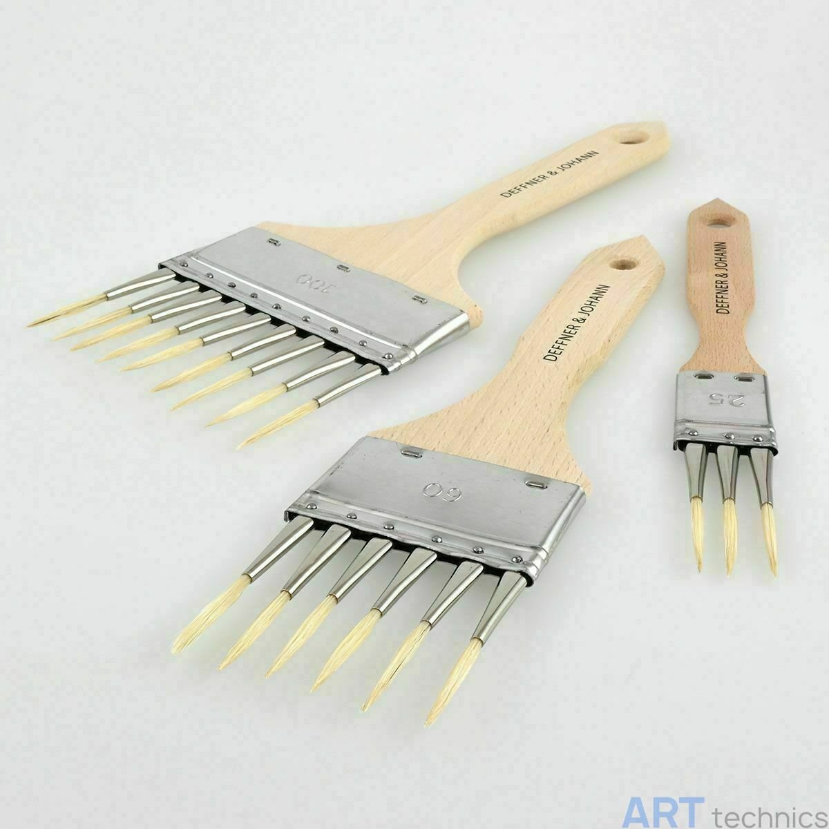 Каждый из наконечников кисти прочно закреплён на широком основании малой булвкой, что исключает люфт и обеспечивает долговечность инструмента даже при интенсивной эксплуатации. Ручки от легендарного бренда Mottler изготовлены из необработанного натурального дерева — они лёгкие, удобные в руке и устойчивы к деформации под воздействием влаги и краски.