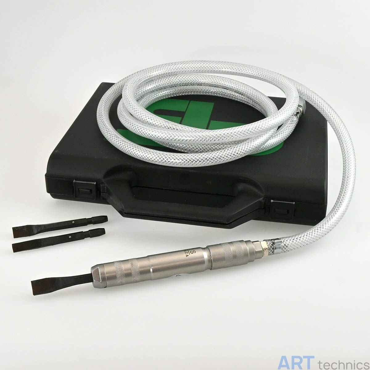 В комплект входят все необходимое для старта: – двухметровый пневмошланг с надёжным резьбовым соединителем, – три плоских резца диаметром 7, 9 и 11 мм для работы с деревом, пластиком, мягким металлом, – прочный футляр для хранения и транспортировки.