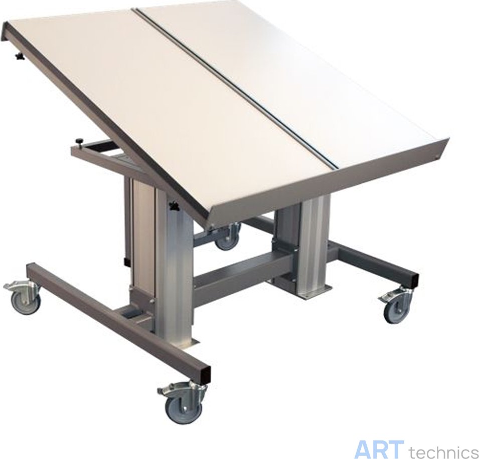 Дополнительно столешница имеет возможность наклона до 70°, что будет полезно при черчении, рисовании или работе с документами под углом. Для перемещения конструкции на полу установлены четыре колеса диаметром 125 мм, оснащённые тормозами. Это облегчает перестановку мебели внутри комнаты и позволяет надёжно зафиксировать стол в нужном месте.